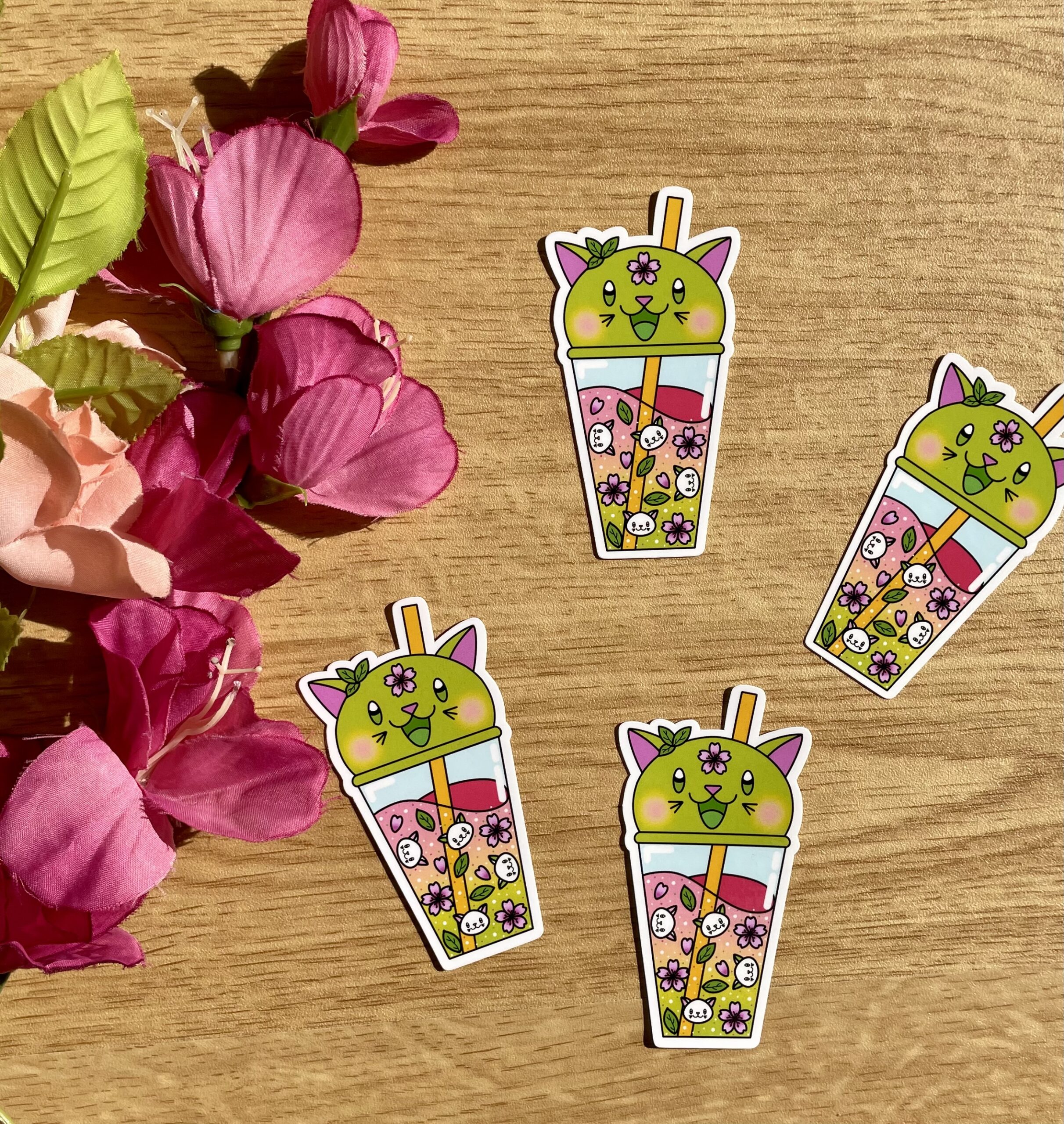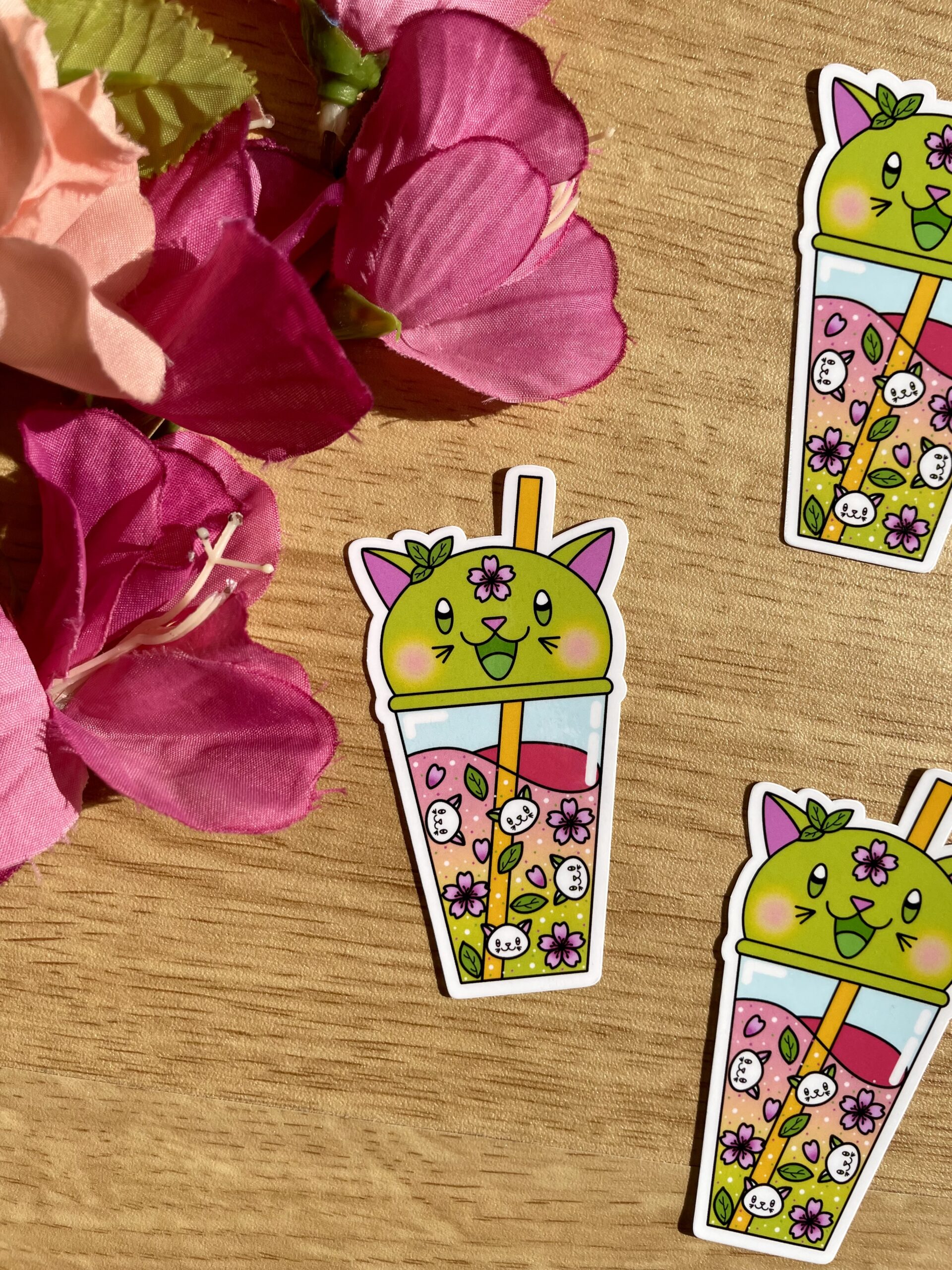 • Il est frais et coloré, c’est le sticker Bubble Kittea Sakura/Matcha ! Succombez à sa douceur et collez-le où vous voulez (sur votre carnet, votre bureau, votre liste de bubble tea préférés…)